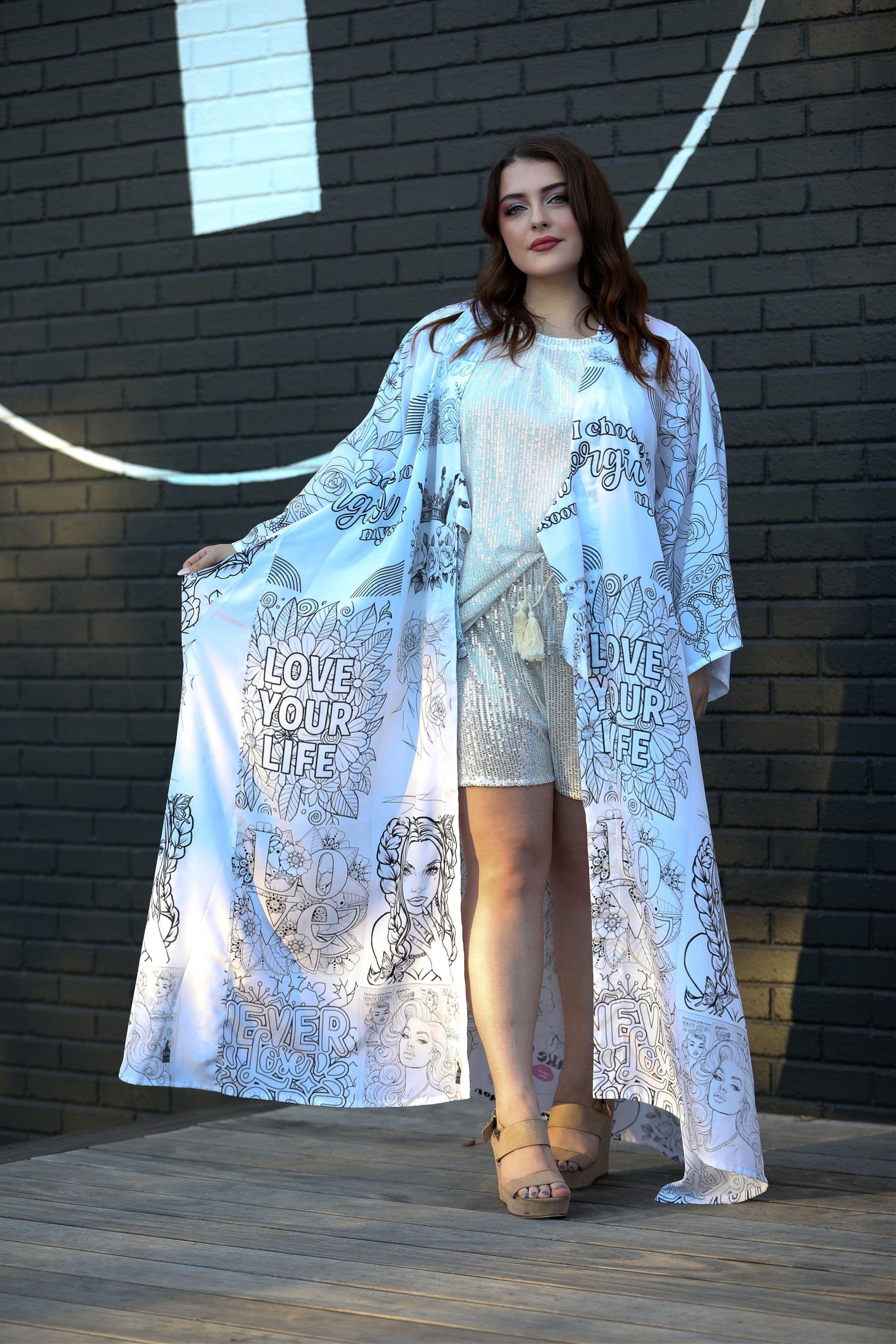 Step into living color with Vernice’s Coloring Book Arte DreamCoat — where fashion meets imagination. Crafted from luxurious crepe, this art-to-wear statement piece features Vernice’s original doodle arte, fashion illustrations, and inspirational word art printed in black line drawings on a crisp white background, reminiscent of a chic coloring book come to life.