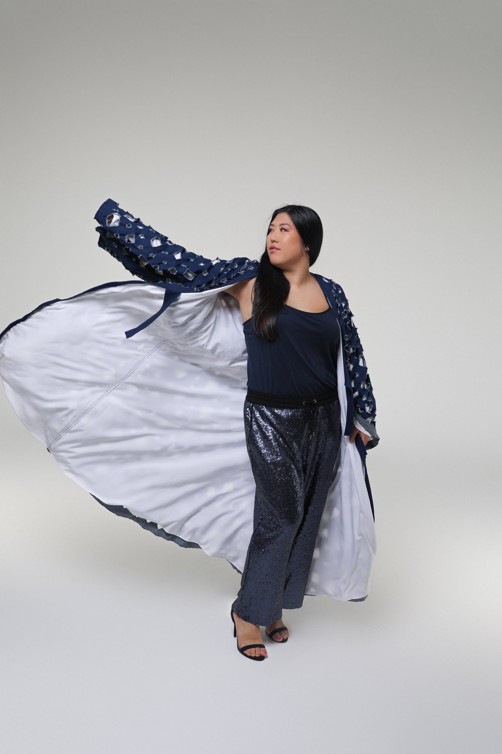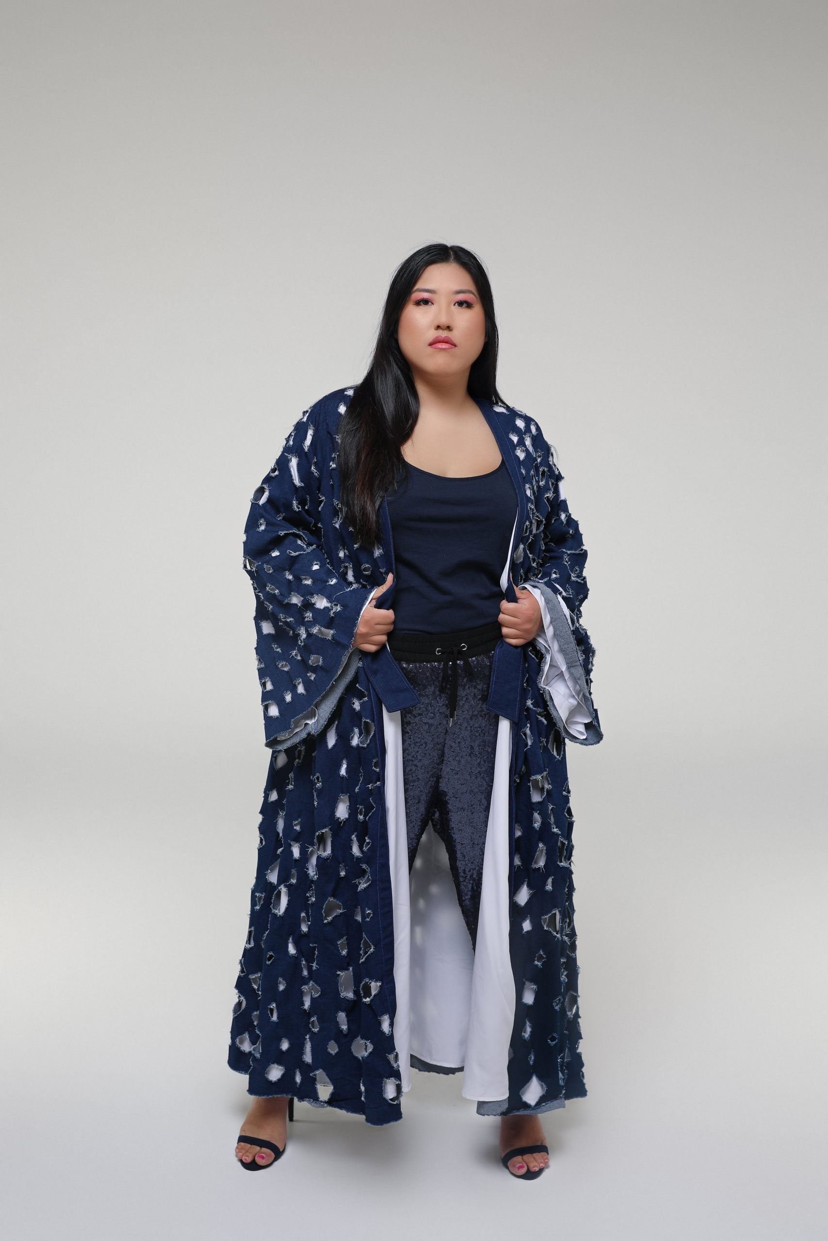This luxurious dreamcoat is crafted from high-quality cotton denim and recycled poly crepe.
