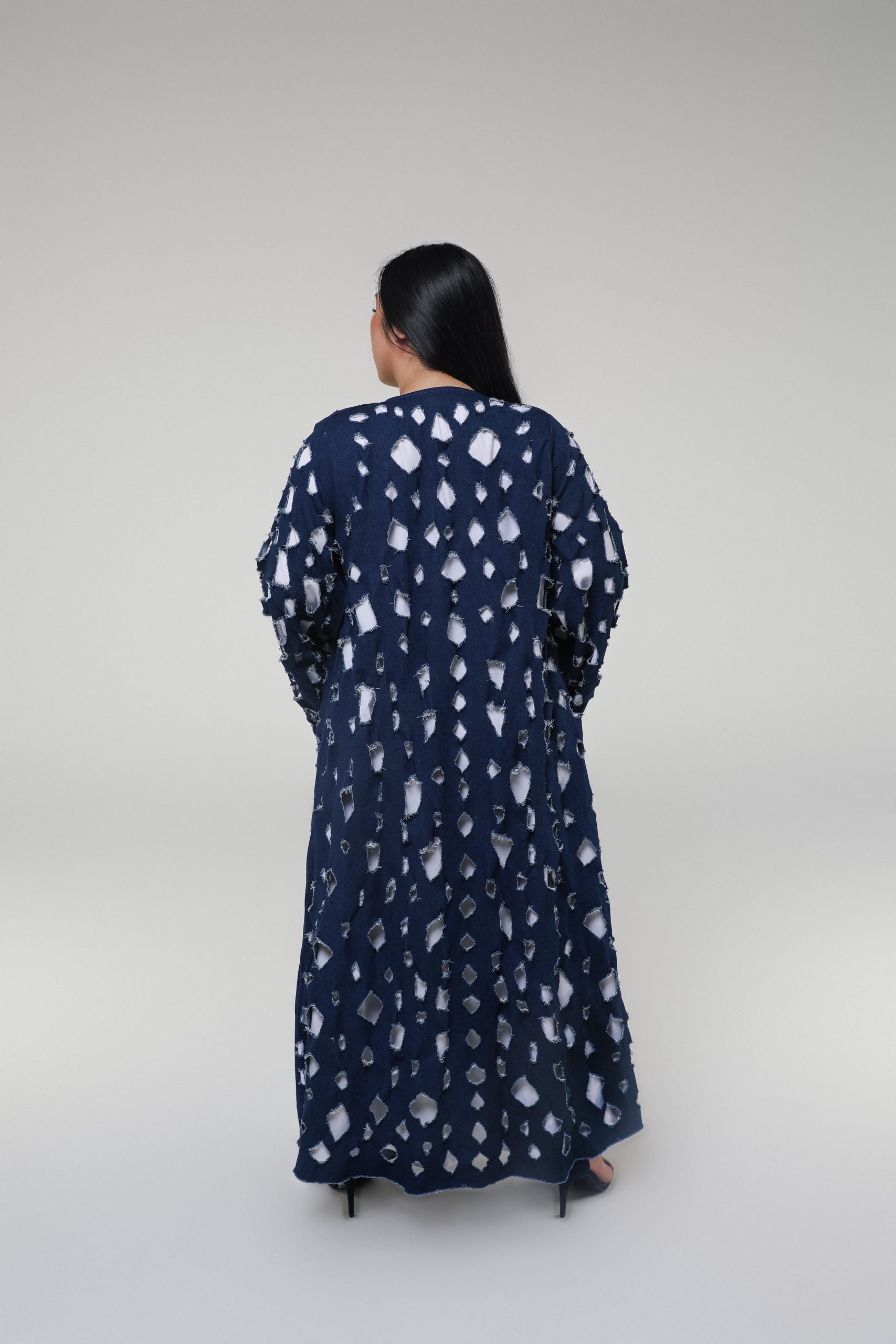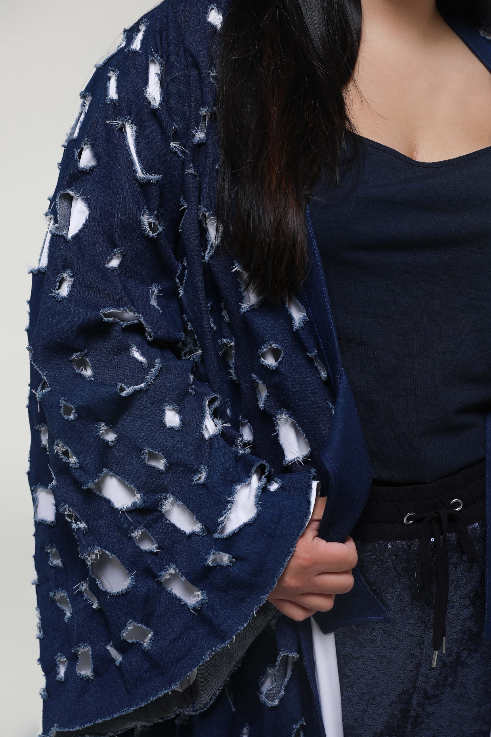 This denim dreamcoat is Jeanius, am I right?! Get ready to float like a butterfly and stun like a queen with this statement-making dreamcoat! This handcrafted placement cutout is created as unique as you are! Jeanius is lined with white crepe to accentuate this peek-a-boo design. This oh-so-chic, versatile, easy-to-wear style works for every shape, size, and occasion imaginable.