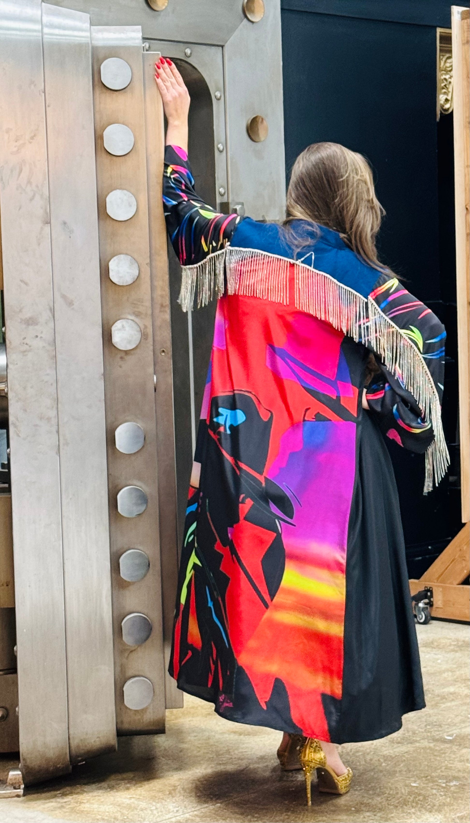 Handcrafted with love and made to order, this mixed-media masterpiece combines denim and crepe for a luxurious feel. The sparkling rhinestone fringe trim on the back and sleeves adds a dazzling touch of rodeo glamour.